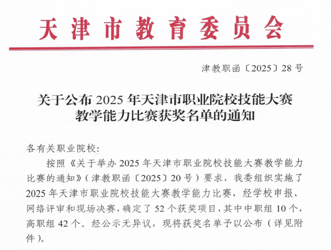 近日,2025年天津市职业院校技能大赛教学能力比赛圆满收官。历经网络评审、现场决赛,我校6支参赛教学团队凭借扎实教学功底、创新教学设计与出色现场展示脱颖而出,最终斩获一等奖3项、二等奖3项,其中一等奖数量创学校近年参赛新高,充分彰显出我校在教师队伍建设与教学改革中的卓越成效。