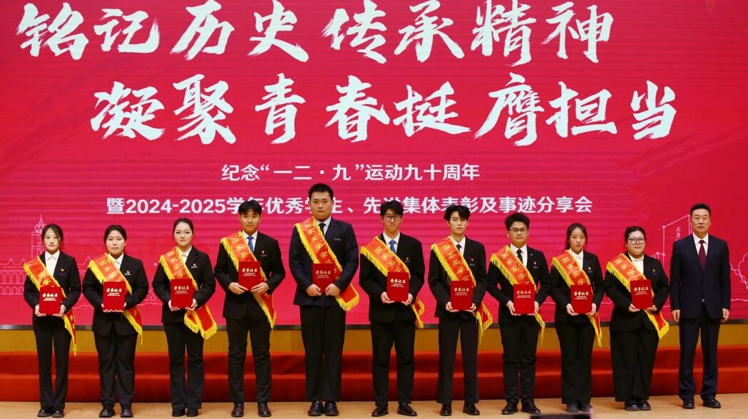 为深入学习贯彻党的二十大和二十届历次全会精神,弘扬伟大爱国主义精神,我校组织召开“铭记历史传承精神 凝聚青春挺膺担当”纪念“一二·九”运动九十周年暨2024-2025学年优秀学生、先进集体表彰及事迹分享会。校领导、相关职能部门及各学院相关负责人、班主任、专业教师、辅导员代表、我校大中小一体化共建学校普育中学的师生代表,获奖学生代表和各专业学院学生代表参加本次大会。