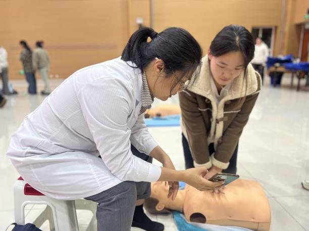 培训中,导师结合真实案例,强调心脏骤停“黄金4分钟”的重要性,详细讲解意识判断、胸外按压、开放气道、人工呼吸等心肺复苏关键步骤,明确“按压深度5-6厘米、频率100-120次/分钟”的技术要点,并演示AED“开机-贴电极-听指令”的规范操作流程。