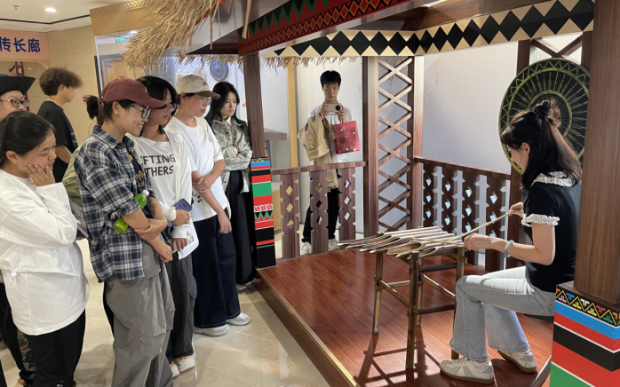 在民族文化宫,师生们在专业讲解员引导下参观“八音回响石榴花开——中国少数民族乐器集萃”展。展厅内丰富的历史文物、文献资料和实物展示,生动呈现了我国少数民族乐器文化的源远流长,大家沉浸式了解56个民族的基本情况。从古老骨笛到现代马头琴,每一件乐器的制作工艺、演奏方式及背后的文化故事,都让师生们深刻感受少数民族文化的独特魅力与深厚底蕴,引发了强烈的情感共鸣。