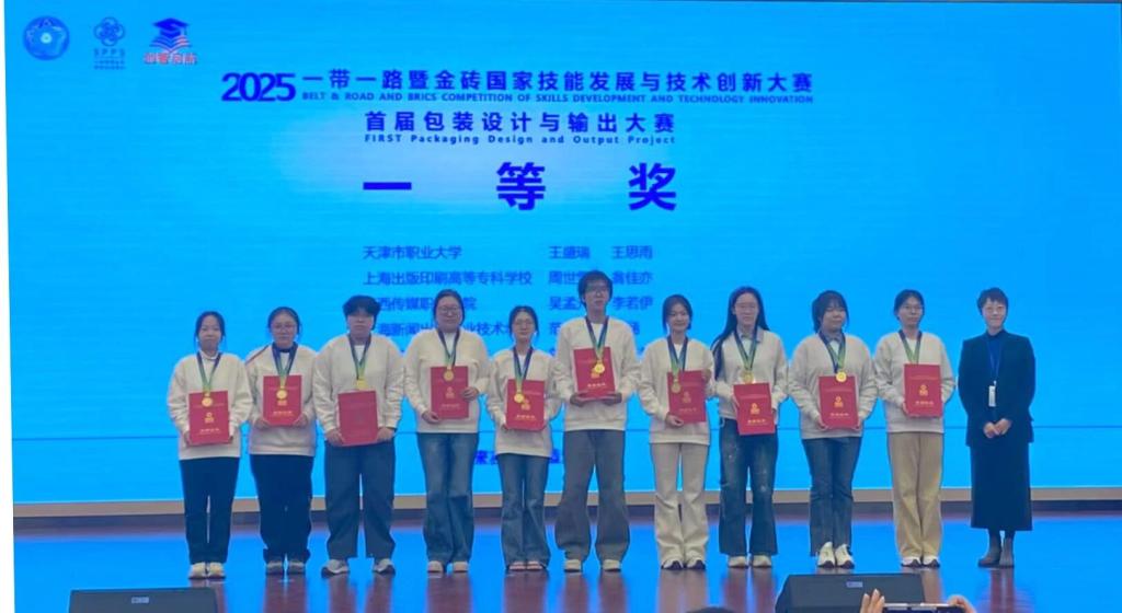 2025年11月29日,“2025一带一路暨金砖国家技能发展与技术创新大赛—首届包装设计与输出大赛”全国总决赛在上海新闻出版职业技术学校圆满落幕,来自全国的45支代表队在包装设计与印刷输出的专业赛道上同台竞技,以精湛技艺践行工匠精神。我校包装与印刷工程学院23级图文专业王盛瑞、23级包装专业王思雨两位同学凭借扎实的专业功底、默契的协作能力和创新的设计理念,从全国众多中高职及本科院校参赛队伍中脱颖而出,成功斩获赛项一等奖第一名,指导教师徐朋飞获评“优秀指导教师”,彰显了我校在包装印刷、图文设计领域的教学实力与人才培养成效。
