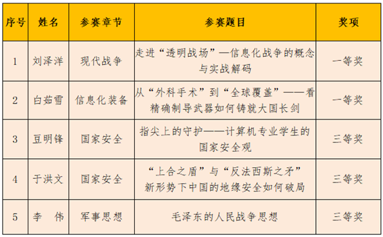 此次大赛共征集参赛作品124件,其中本科院校组71件、高职院校组53件,经专家网络评审,60件优秀作品晋级现场决赛。我校军事理论课教师积极参与比赛作品的申报,报送的5件作品全部晋级现场决赛。决赛中,本科、高职各30名参赛教师分组竞技、切磋比拼,最终,我校教师凭借丰富的教学内容、精巧的教学设计、新颖的教学手段、得体的教姿教态和出色的现场表现斩获佳绩。