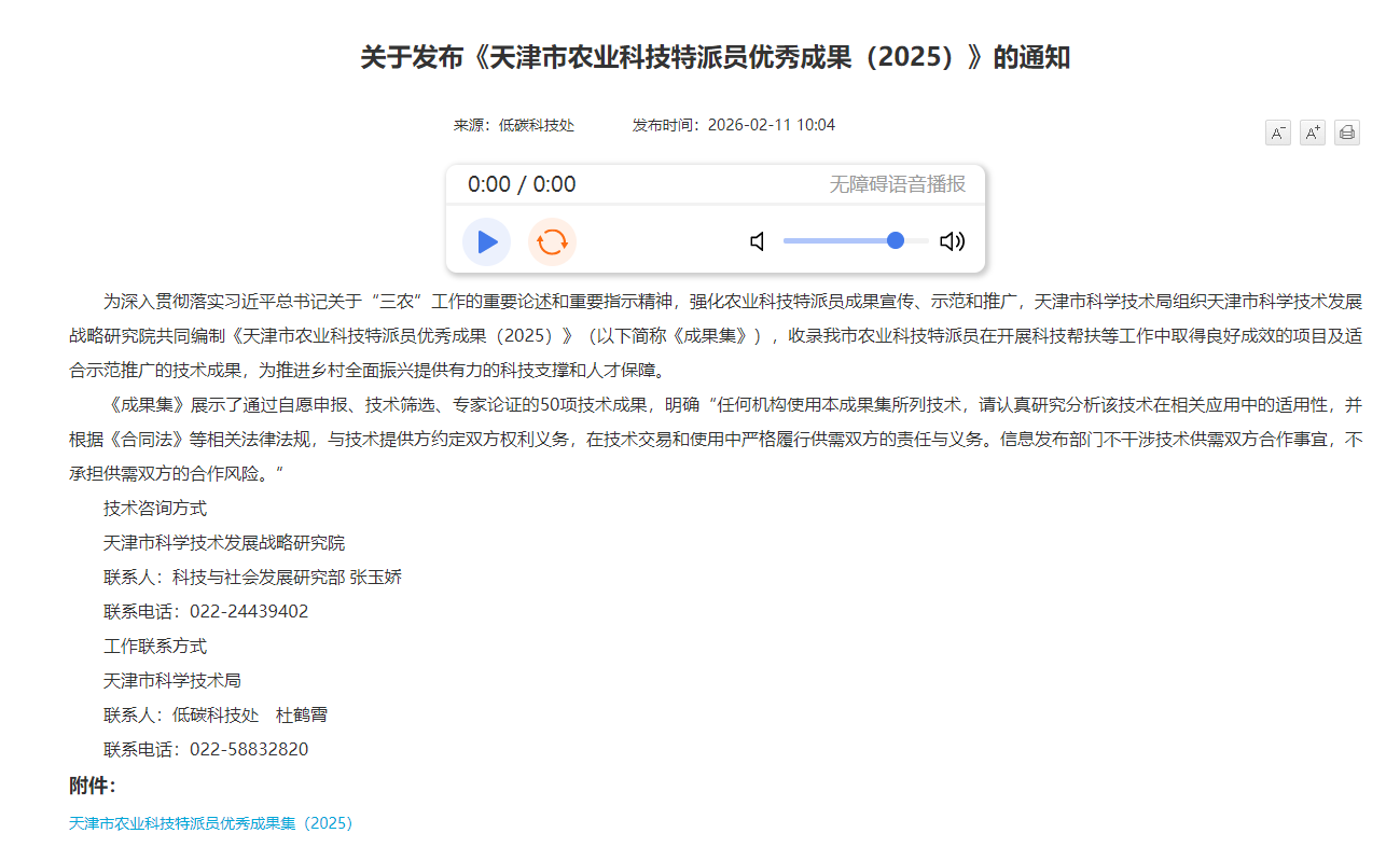 为深入贯彻落实习近平总书记关于“三农”工作的重要论述和重要指示精神,强化农业科技特派员成果宣传、示范和推广,近日,由天津市科学技术局组织天津市科学技术发展战略研究院共同编制的《天津市农业科技特派员优秀成果(2025)》正式发布,集中收录了一批在科技帮扶一线取得显著成效、具备良好示范推广价值的技术成果。